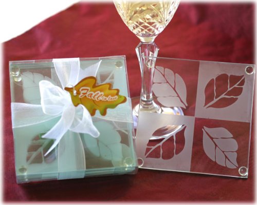 Thank your guests for attending your fall celebration with these frosted glass coasters. These glass coaster favor sets make a wonderful gift your guests are sure to cherish for years to come. Each glass coaster set includes four 3.5" x 3.5" high quality coasters with an elegant frosted leaf design. They are packaged for the perfect presentation in a clear gift box complete with sheer organza ribbon and a Leaf design tag that reads "Fall in Love".